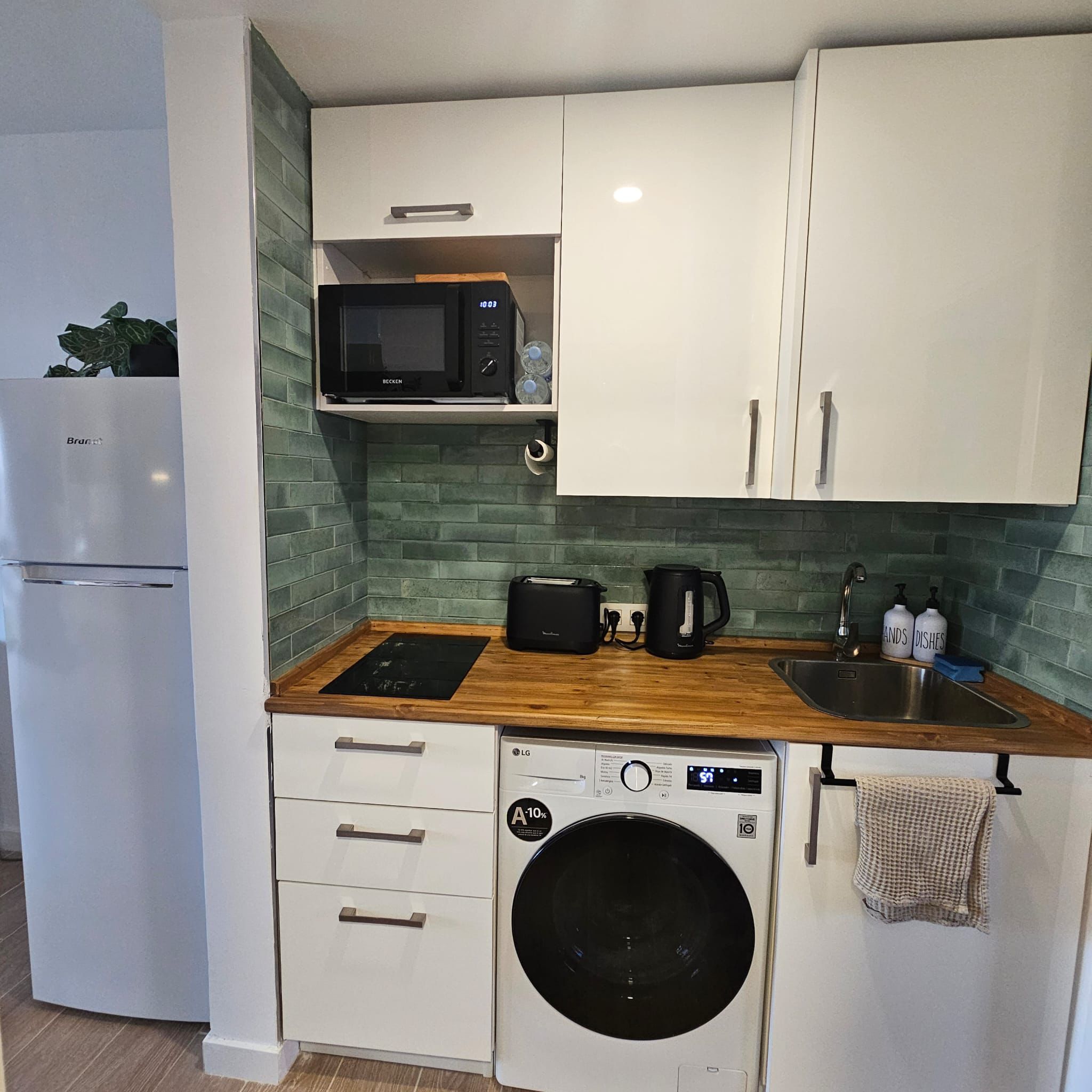 - Kitchenette includes Microwave with grill, Toaster/Kettle/Hob. Washing machine, Fridge-freezer, Hoover, Beach towels, Iron and board